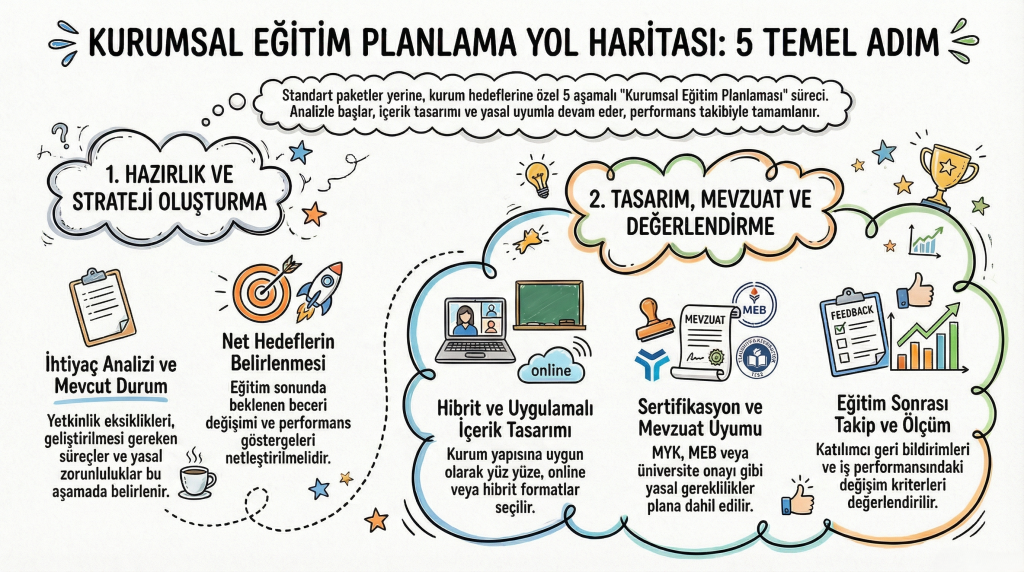 Kurumlara özel eğitim planlaması; kurumun hedeflerine, mevcut yetkinlik düzeyine ve sektörel gerekliliklere göre tasarlanan yapılandırılmış bir süreçtir.